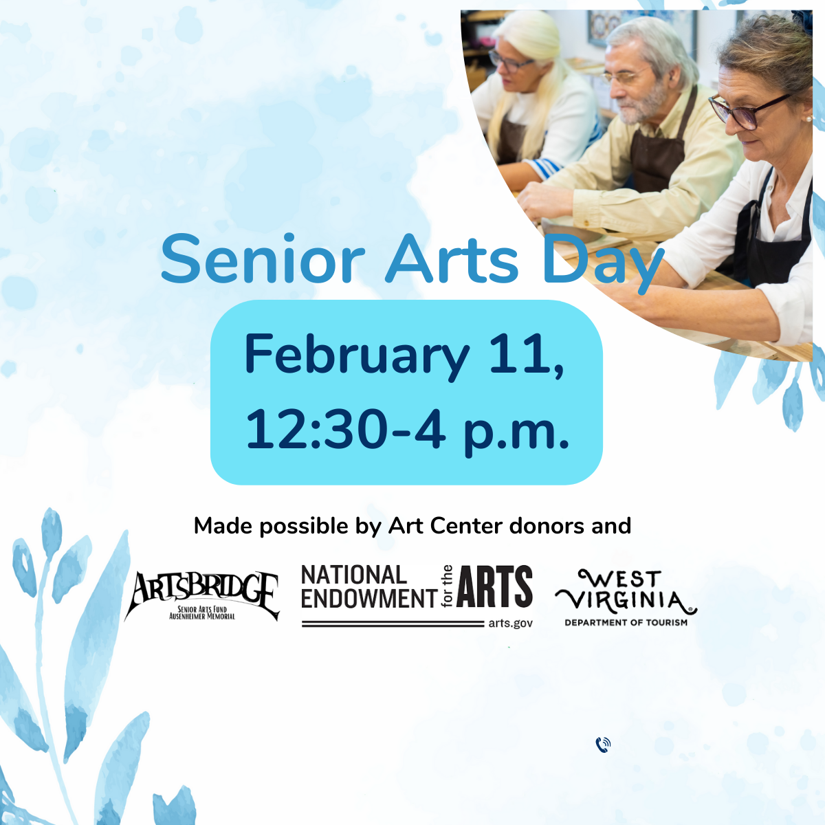 Senior Arts Day 2026 takes place on Wednesday, February 11 starting at 12:30 p.m. offers a free afternoon of socializing, creating and learning for older adults 55 and over. Participants are invited to explore hands-on art workshops, watch live demonstrations, and enjoy refreshments in a welcoming, relaxed environment. Workshops begin at 12:30 p.m., followed by a Meet & Mingle break with light refreshments at 2:00 p.m., and a second workshop session at 2:30 p.m.